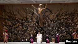 „ბევრად უკეთ ვარ, მაგრამ მიჭირს, როცა ძალიან ბევრს ვლაპარაკობ“, - თქვა პაპმა ყოველკვირეული მიმართვის დასაწყისში და ტექსტის წაკითხვა თანაშემწეს სთხოვა.