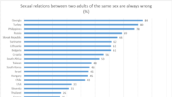 ორგანიზაციამ კვლევა 33 ქვეყანაში ჩაატარა. საქართველოში გამოკითხულთა 84% მიიჩნევს, რომ „ორ ზრდასრულ, ერთსა და იმავე სქესის ადამიანს შორის სექსუალური ურთიერთობა ყოველთვის არასწორია.“ ამ მაჩვენებლით, საქართველო სიის სათავეშია და მას 80%-ით თან მოსდევს თურქეთი, 78%-ით ფილიპინები და 69%-ით რუსეთი. გამოკითხვა არ ჩატარებულა საქართველოს ორ მეზობელ ქვეყანაში, აზერბაიჯანსა და სომხეთში.