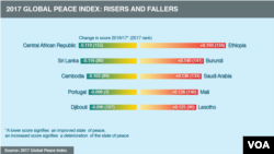 გლობალური მშვიდობის ინდექსის მიხედვით, ტერორისტული თავდასხმები მსოფლიოს გარშემო გახშირდა. ტერორიზმი გლობალურ ეკონომიკას გასულ წელს 14.3 ტრილიონი დოლარი დაუჯდა. ორგანიზაციის თქმით, 2011 წლის შემდეგ ყოველწლიური ტერორისტული აქტების რაოდენობა გასამმაგდა. შეფასებულ ქვეყნებს შორის სირია ყველაზე საშიში ქვეყანაა, გამომდინარე შიდა კონფლიქტისა და ტერორიზმის საფრთხისგან. ასევე შემცირდა ამერიკის შეერთებული შტატების რეიტინგიც.
