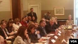 მაია ფანჯიკიძეს ოპონირებას უწევდა ჟურნალის „უიქლი სტანდარტ“ (The Weekly Standard - ყოვლკვირეული სტანდარტი) მთავარი რედაქტორი, კრისტოფერ კალდუელი. საათნახევრიანი შეხვედრის დასაწყისში სიტყვით გამოვიდნენ საქართველოს საგარეო საქმეთა მინისტრი და ნეოკონსერვატიული მიმართულებით ცნობილი ჟურნალის ხელმძღვანელი. დისკუსია მიყავდა გერმანიის მარშალის ფონდის ვიცე-პრეზიდენტს, ივან ვეჯვოდას.