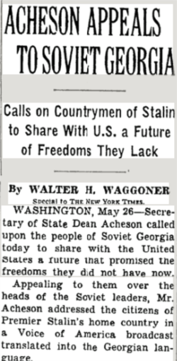 გაკეთებული 26 მაისს 1951 წელს. ამერიკის შეერთებული შტატების საგარეო მინისტრის აჩესონის მიერ, „ამერიკის ხმის“ ქართული სექციის გახსნის გამო.
